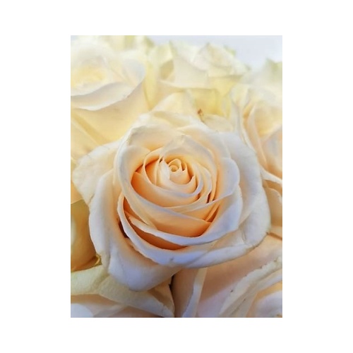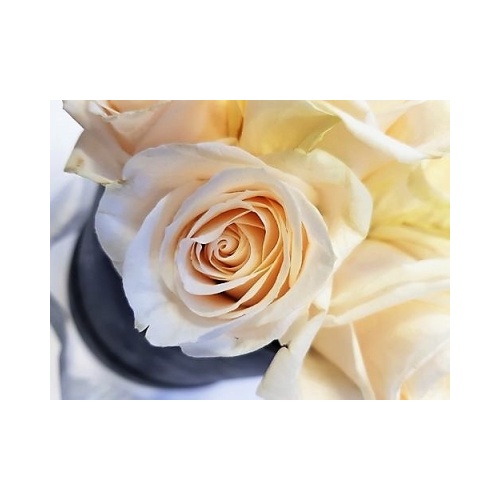 Elegantna i moderna cvjetna dekoracija sastoji se od 7 nježno bijelih ruža uredno posloženih u okruglu kutiju sive boje s pripadajućim poklopcem. Ruže su aranžirane u profesionalnu cvjećarsku spužvu koja danima drži vlagu. Dimenzije 13,8x15cm.