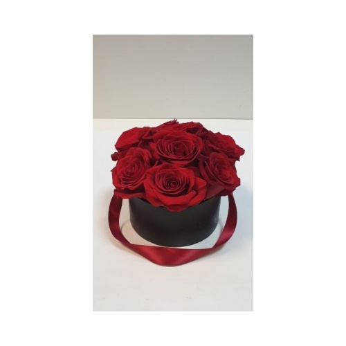 Romantična i elegantna dekoracija sastoji se od 9 crvenih ruža složenih u okruglu crnu kutiju s poklopcem. Ruže su aranžirane u profesionalnu cvjećarsku spužvu koja danima drži vlagu. Dimenzije kutije:16×8cm .