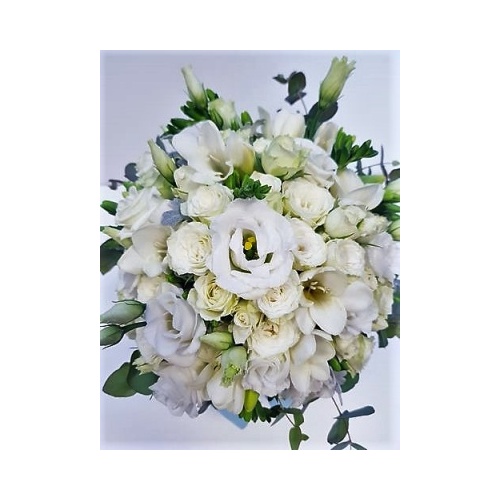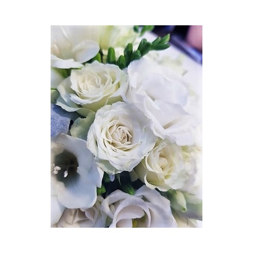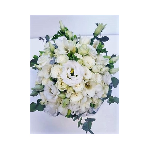 Nježno bijela cvjetna dekoracija se od lizantusa, ruža, frezija i sezonskog dekorativnog zelenila u modernoj svijetlo sivoj kutiji s poklopcem. Dimenzije: 13,8x15cm. Cvjetna dekoracija dolazi u profesionalnoj cvjećarskoj vrećici sa vodom, stoga buket nije potrebno vaditi iz kutije.