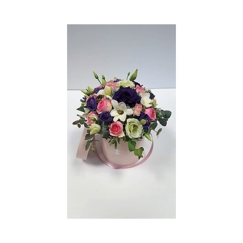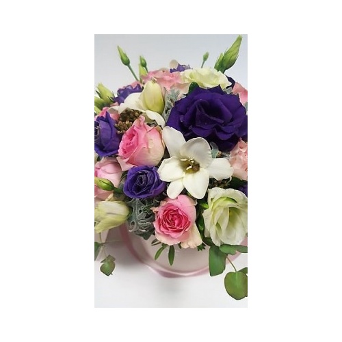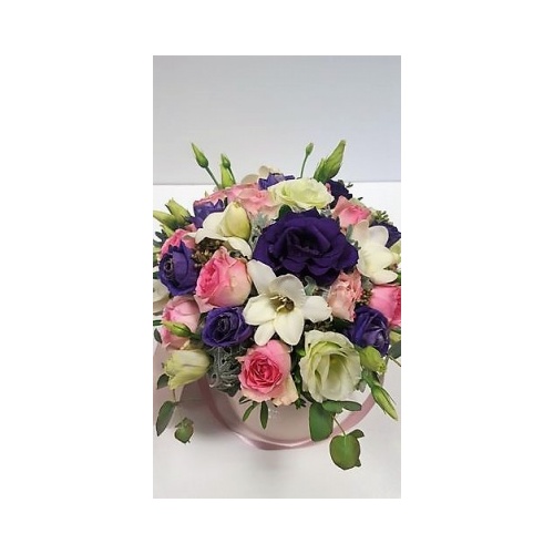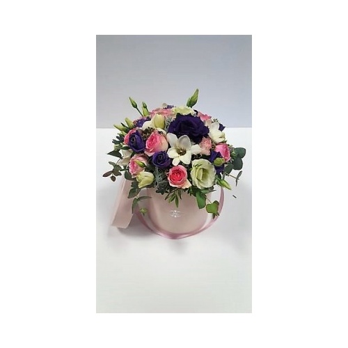 Lepršava i elegantna cvjetna dekoracija sastoji se od mini ružića, lizantusa, frezija i sezonskog dekorativnog zelenila u modernoj kutiji roza boje sa poklopcem. Dimenzije: 13,8x15cm. Cvjetna dekoracija dolazi u profesionalnoj cvjećarskoj vrećici sa vodom, stoga buket nije potrebno vaditi iz kutije.