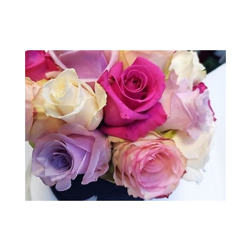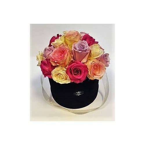 Četiri skladne boje ruža čine ovu šarenu, a ipak vrlo elegantnu cvjetnu dekoraciju. Dekoracija je smještena u modernu okruglu kutiju crne boje dimenzija 21x15cm. Ruže su složene u profesionalnu cvjećarsku spužvu koja danima drži vlagu. Puna kutija sadrži 20 – 23 ruže (broj ruža ovisi o veličini glavica ruža).