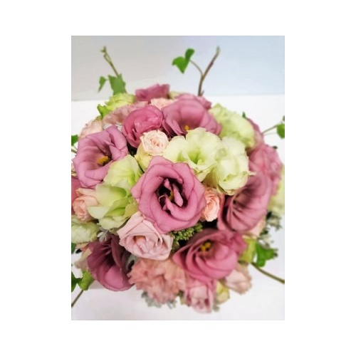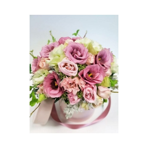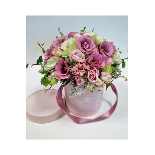 Nježno roza cvjetna dekoracija sastoji se od liziantusa u nekoliko nijansa roza boje i sezonskog dekorativnog zelenila.Cvjetna dekoracija aranžirana je u profesionalnu cvjećarsku spužvu koja danima drži vlagu i dolazi u modernoj kutiji s poklopcem dim.13,8×15cm