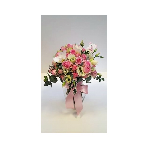 Čestitajte roditeljima i poželite dobrodošlicu maloj djevojčici ovom nježnom cvjetnom dekoracijom u staklenoj vazi. Dimenzije 20x10cm. Buket se sastoji od liziantusa, frezija i mini ružica, te dekorativnog zelenila.
