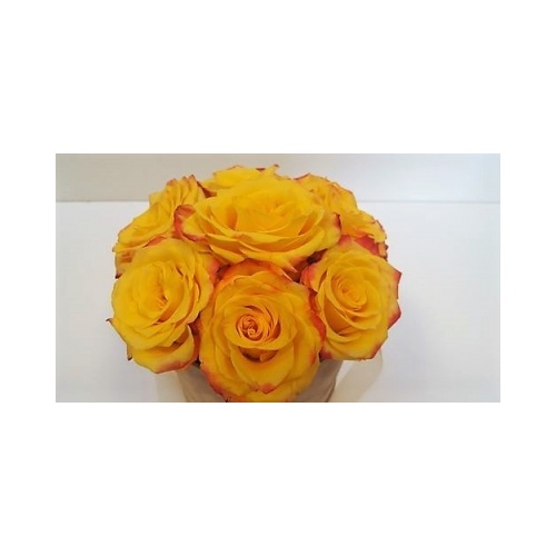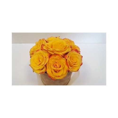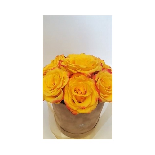 Moderna i elegantna cvjetna dekoracija u toplim žutim nijansama. Sastoji se od 7 žutih ruža ruža složenih u okruglu kutiju bež boje s poklopcem. Dimenzije 13,8x15cm. Ruže su aranžirane u profesionalnu cvjećarsku spužvu koja danima drži vlagu.